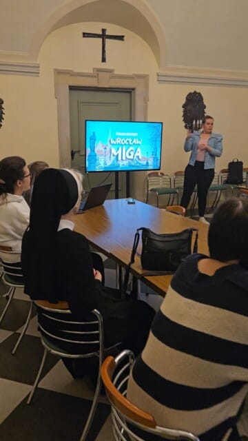 Przypominamy, że spotkania koła języka migowego „Wrocław miga” organizujemy od października 2025 roku. Spotykamy się w każdą pierwszą środę miesiąca na wrocławskim Ostrowie Tumskim. Udział w nich jest bezpłatny, zaś do udziału zapraszamy zarówno osoby g/Głuche, jak i słyszące. Przy czym – co warte podkreślenia – jedyną dopuszczalną formą przekazywania treści jest język migowy.