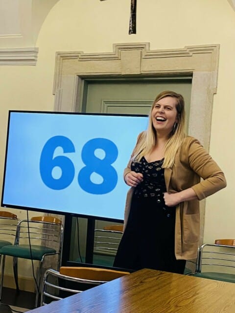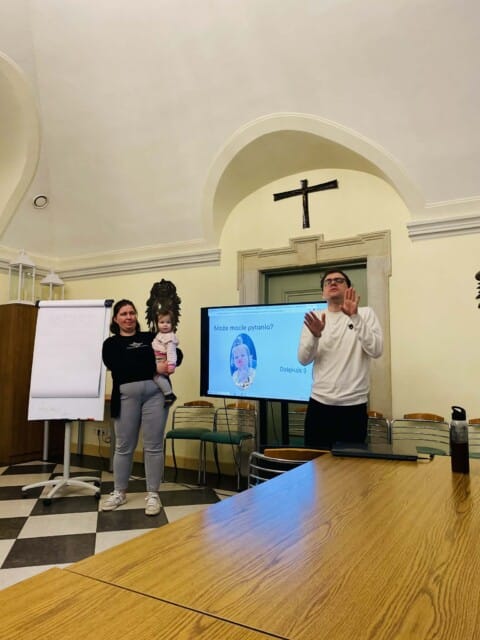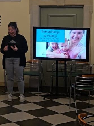 Środowe spotkanie tradycyjnie obejmowało kilka elementów. Była więc nauka Polskiego Języka Migowego, była zabawa w kalambury rysunkowe i była też przestrzeń na rozmowy w kuluarach. Najwięcej czasu jednak poświęciliśmy prelekcji, którą przygotowała Maria Gasiewicz. Matka dwójki dzieci dzieliła się swoim doświadczeniem. Opowiadała o realiach towarzyszących rodzicom wychowującym słyszące dzieci. Poleciła kilka książek, które łatwo można uzupełnić o znaki języka migowego i wykorzystać do edukacji maluchów. Czytanie wzbogacone o przekaz migowy wspiera rozwój komunikacji między dzieckiem a rodzicami. Prelekcja Marii była połączona z pokazem filmików prezentujących gesty, których nauczyły się jej dzieci.