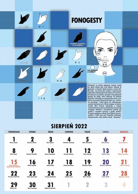 W Kalendarzu Niesłyszących na rok 2022 tematem przewodnim natomiast jest komunikacja osób z niepełnosprawnością. Dlatego też na poszczególnych kartach Kalendarza prezentujemy w sposób graficzny wybrane alfabety języka migowego: polski, ukraiński, węgierski, brytyjski, międzynarodowy, a także turecki. Ponadto mają w nim swoje karty alternatywne sposoby komunikacji (AAC). Są to: alfabet Braille’a, alfabet Lorma, fonogesty, piktogramy, Program Językowy MAKATON czy też pismo logograficzne Blissa. Poza tym do graficznego przedstawienia wybranych form komunikacji dołączyliśmy krótki tekst. W ten sposób można zapoznać się z podstawowymi wiadomościami o różnych formach komunikacji alternatywnej. Teksty zredagowane są w standardzie prostego języka dostosowanym do potrzeb osób z niepełnosprawnością słuchu. Oczywiście wydany przez nas kalendarz pełni również typową dla siebie funkcję, czyli wskazuje nam miesiące i dni. Autorką projektu graficznego tegorocznego Kalendarza jest niesłysząca graficzka Alicja Zawada.