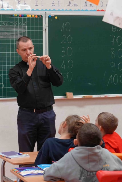 Dwoje przedstawicieli Fundacji FONIS wyruszyło do szkoły zaraz po Święcie Niepodległości. We wtorkowy poranek Dominika i ks. Tomek przybyli na ulicę Kraińskiego 1, by przeprowadzić zajęcia dla czterech grup. Były to dwie klasy drugie i dwie klasy trzecie.