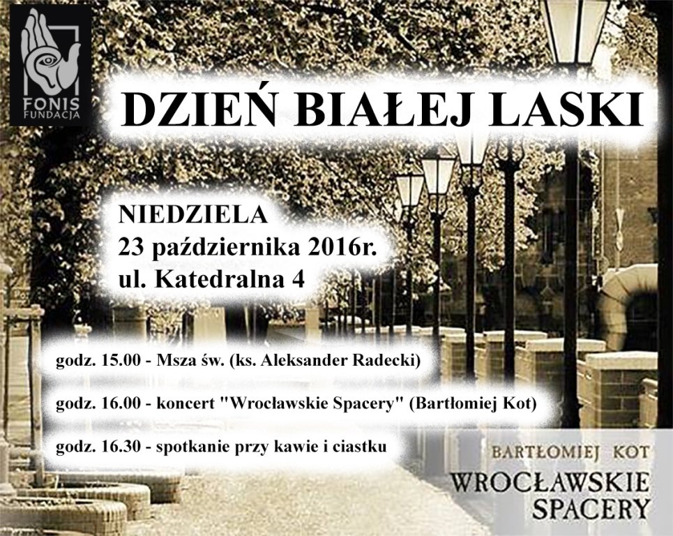 Z okazji Dnia Białej Laski, które przypada 15 października, wszystkim niewidomym i słabowidzącym składamy najlepsze życzenia i zapraszamy do wspólnego świętowania. W niedzielę 23 października 2016 roku przy ul. Katedralnej 4 wraz z Duszpasterstwem Niewidomych Archidiecezji Wrocławskiej będziemy przeżywać Dzień Białej Laski.Program świętowania przedstawia się następująco: