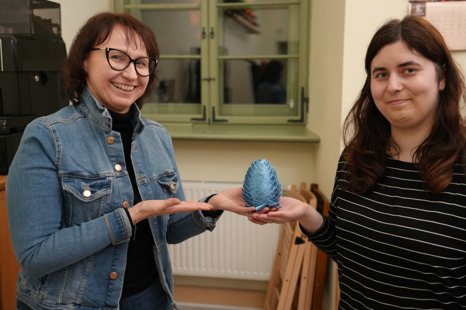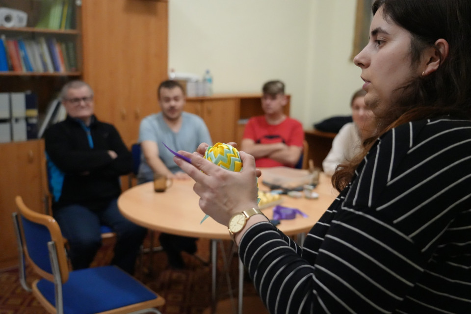 Ale od początku… Inicjatorką spotkania była nasza wolontariuszka Edyta. Jej propozycja zorganizowania warsztatów wielkanocnych spotkała się z zainteresowaniem wśród niesłyszących i słabosłyszących. Zarezerwowaliśmy więc w kalendarzu spotkań dwa wieczory (dziś był pierwszy) i zaprosili do działania. Każdy uczestnik otrzymał styropianowe jajo, mnóstwo kolorowych wstążek i tyleż samo szpilek. Po krótkiej instrukcji, jak wykonać kolorowe rękodzieło, zabraliśmy się do pracy. Ci odważniejsi manualnie postawili na różnobarwność, ci mniej odważni na jednobarwność swoich arcydzieł. Praca rzeczywiście wymagała skupienia i precyzji, co dla tych mniej cierpliwych było nie lada wyzwaniem. Ale wszyscy uczestnicy podołali temu wyzwaniu. Pod koniec spotkania było już widać efekty naszej pracy. Niektórzy nawet skończyli swoje pierwsze arcydzieła.